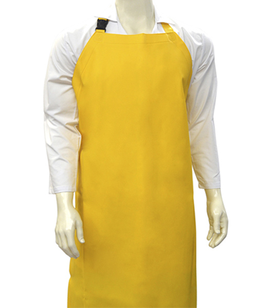 Peto con una sola tapa impermeable con una tira como apoyo en el cuello con broche clack y correa para anudar en la parte trasera de la cintura.